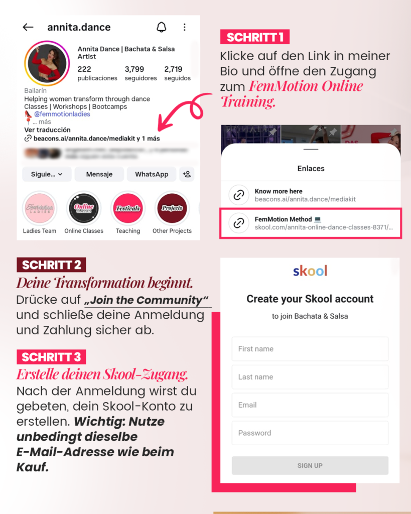 Schritt 1: Klicke auf den Link in meiner Bio und öffne den Zugang zum FemMotion Online Training.